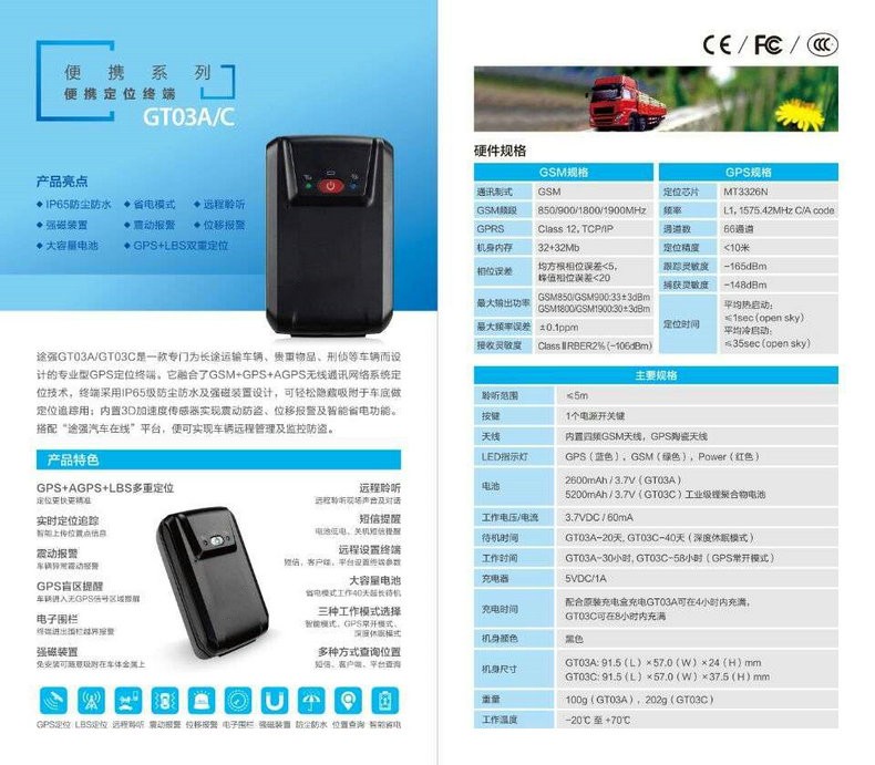 途強GT03A/GT03C是一款專門為長途運輸車輛、貴重物品、刑偵等車輛而設計的專業型GPS定位終端。它融合了GSM+GPS+ AGPS無線通訊網絡系統定位技術,終端采用IP65級防塵防水及強磁裝置設計,可輕松隱藏吸附于車底做定位追蹤用:內置3D加速度傳感器實現震動防盜、位移報警及智能省電功能。